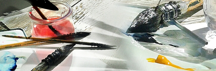 Couleurs : Jaune citron, jaune de cadmium, rouge vermillon, laque alizarine, rose (rose opéra sennelier), bleu de céruléum, bleu outremer, bleu de prusse, vert de vessie, vert émeraude, terre de sienne brûlée.